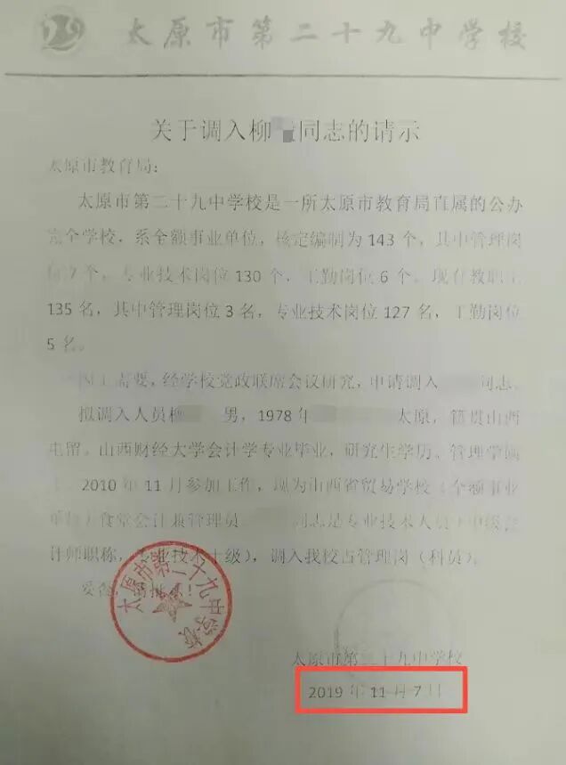 柳先生告诉记者,当年调到太原二十九中后,他发现调动是违规的:审批盖章是空白的;批准日期竟比申请日期还早15天;他的专业技术人员10级被写成了科员9级。