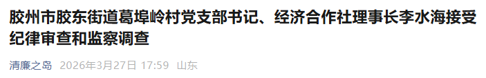 胶州市胶东街道葛埠岭村党支部书记、经济合作社理事长李水海涉嫌严重违纪违法,目前正接受胶州市纪委监委纪律审查和监察调查。