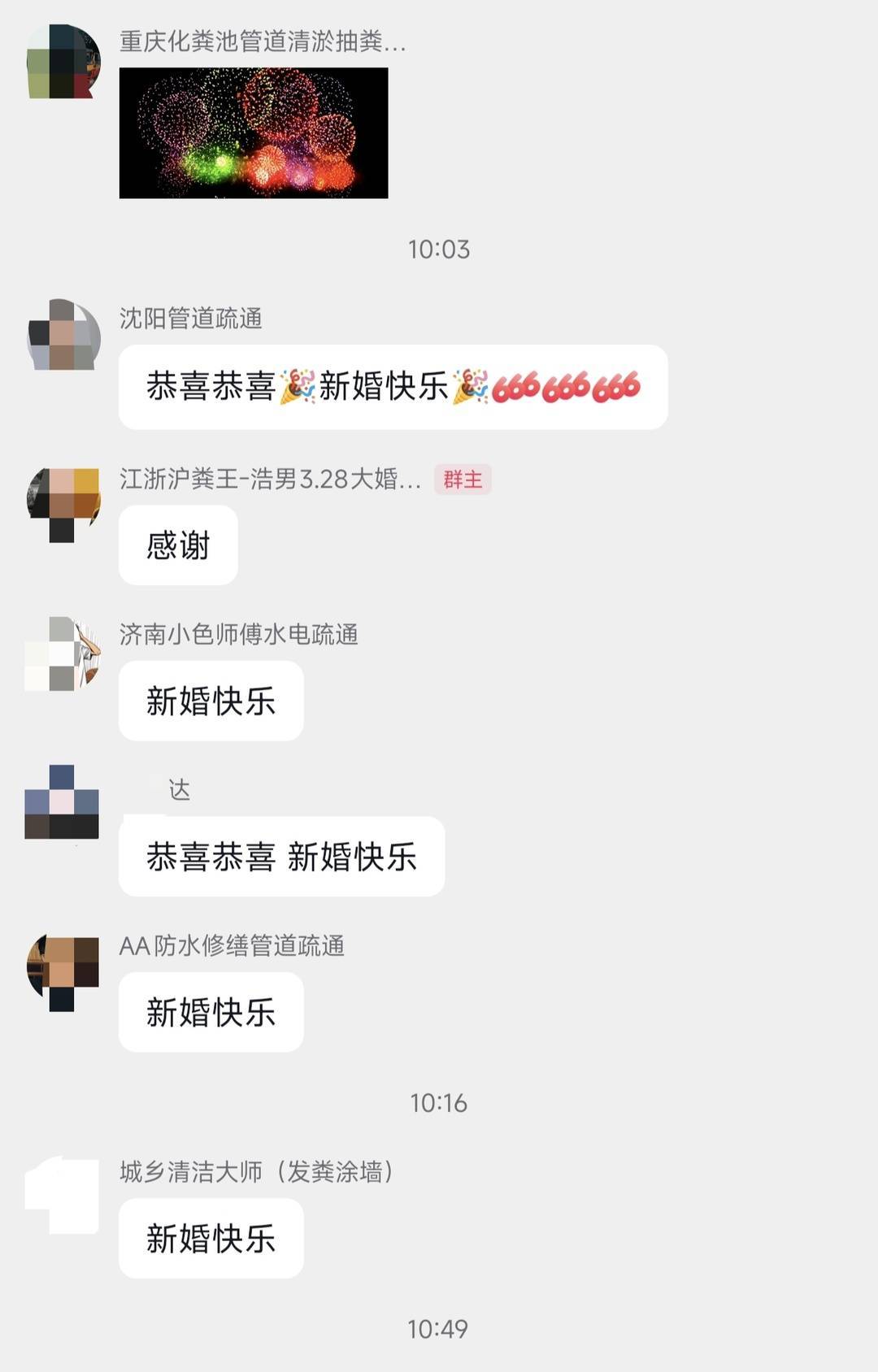 封面新闻记者注意到,在潘浩男的行业群里,他的这场吸粪婚车婚礼受到同行的广泛关注和祝福。