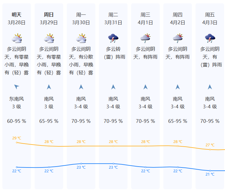 预计28-30日大致多云,早晚有轻雾或雾,间中偶有阵雨;