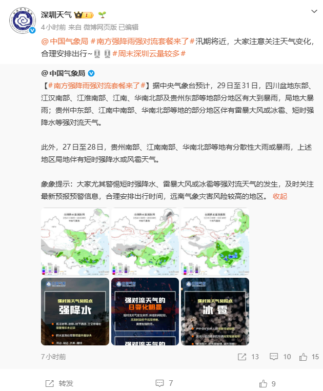 预计29日至31日,四川盆地东部、江汉、江淮南部、江南、华南北部及贵州东部等地部分地区有大到暴雨,江南等地局地有大暴雨;上述地区局地伴有雷暴大风或冰雹、短时强降水等强对流天气。