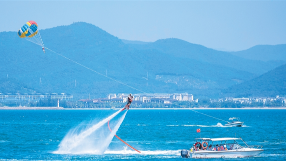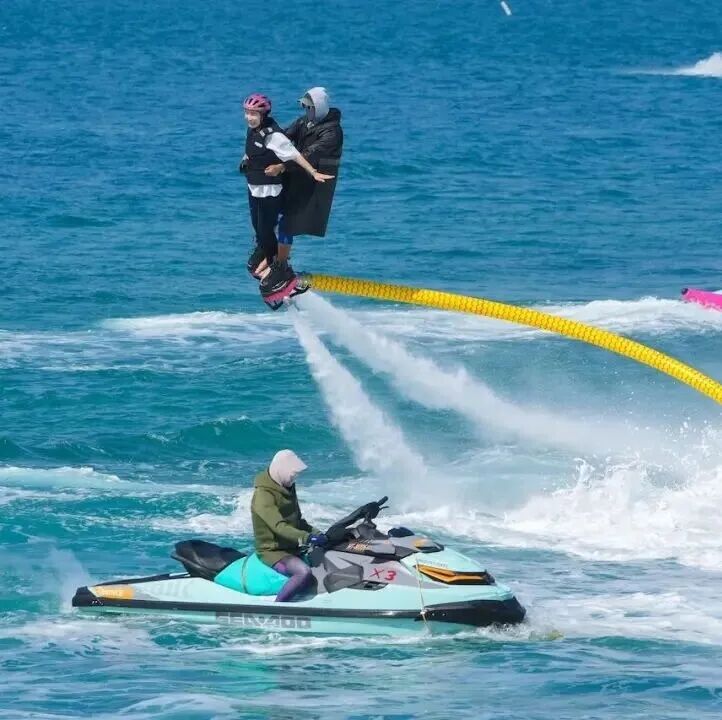 火炬传递路线紧扣三亚亚沙会沙滩水上运动核心,沿途打造多场景水上运动展演,从起点的摩托艇、水上飞人花式表演,到海面的水上项目集中秀,花式皮划艇、尾波冲浪、帆船、香蕉船等项目轮番登场,碧海之上尽显速度与激情,生动诠释三亚亚沙会“绿色、共享、开放、廉洁” 的办赛理念,让观众沉浸式感受沙滩水上运动的独特魅力。同时,火炬传递串联游跑两项、公开水域游泳、沙滩水球等竞赛区域,工作人员专业应援,实现火炬传递与赛事特色的深度融合。