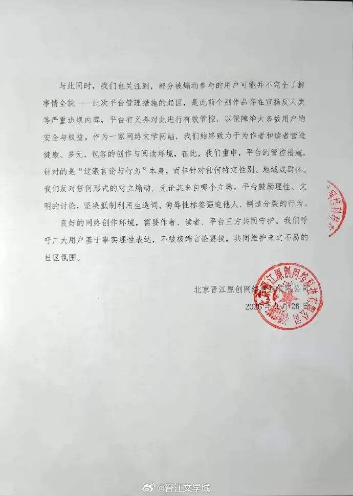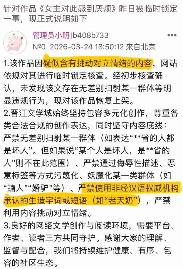 锁文事件引发舆论后,晋江平台管理员小明发帖说明《女主对此感到厌烦》临时锁定事件,称该作品因疑似含有挑动对立情绪的内容,网站依规对其进行临时锁定核查。经初步核查确认,未发现该文存在无差别扫射某一群体等明显违规行为,现对该作品恢复上架。