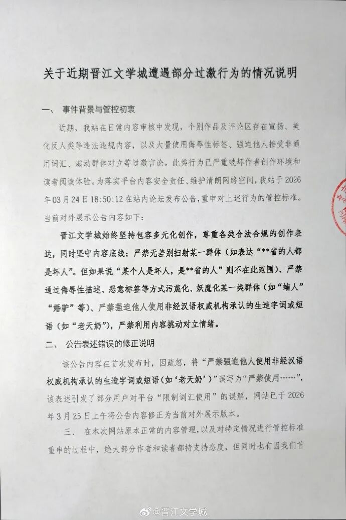 3月26日下午,@晋江文学城 发布《关于近期晋江文学城遭遇部分过激行为的情况说明》回应近期热议事件。