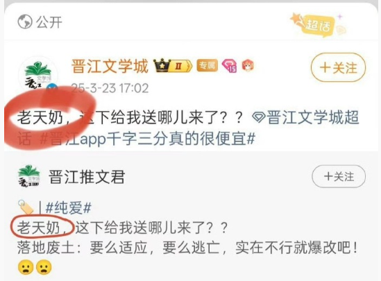 然而,这份说明中关于内容审核的具体标准,却引发了更大的争议。说明中明确“严禁使用非经汉语权威机构承认的生造字词或短语”,并举例“老天奶(为网络通用口语,类似‘老天爷’的变体)”。但有用户发现,晋江官方账号此前曾使用“老天奶”一词进行内容宣传。在被用户质疑后,相关博文已被删除。