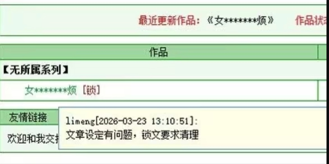 风波始于晋江文学城于近日突然锁定热门女性向小说《女主对此感到厌烦》,相关提示为“文章设定有问题,锁文要求清理”。这一操作迅速引发读者的不满与质疑。