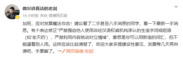 面对用户的集中开票行为,晋江原创网络科技有限公司副总裁刘旭东通过个人微博账号@偶尔讲真话的老刘 公开发文,将用户的开发票行为称为“魔法攻击”,并抱怨员工“手累酸了”,呼吁用户“等几天再申请”。这番言论非但未能安抚情绪,反而引发了更强烈的反弹。