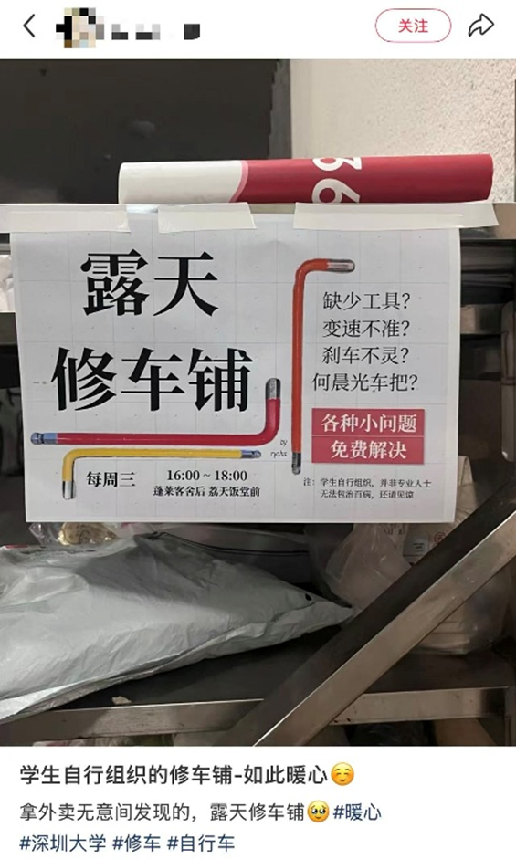 据悉,该“爱心修车铺”位于深圳大学粤海校区蓬莱客舍与荔天饭堂之间的空地,计划于每周三定期开展服务,具体地点将视天气情况在粤海校区内固定区域设点。