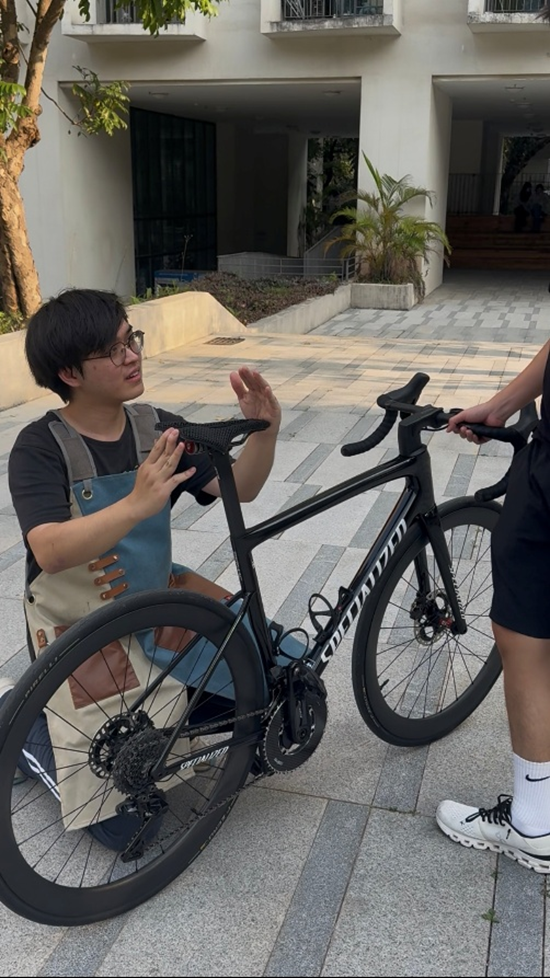 在现场,前来修车的刘同学告诉记者,他在协会群里看到了“爱心修车铺”摆摊消息,便第一时间过来支持。“梁同学的举动真的很好,校内骑行人数多,修车需求确实很大。梁同学态度特别认真,我在旁边看着也学到了很多维修知识。”刘同学还表示,自己也有兴趣深入学习相关技术,参与到修车铺的服务中来。