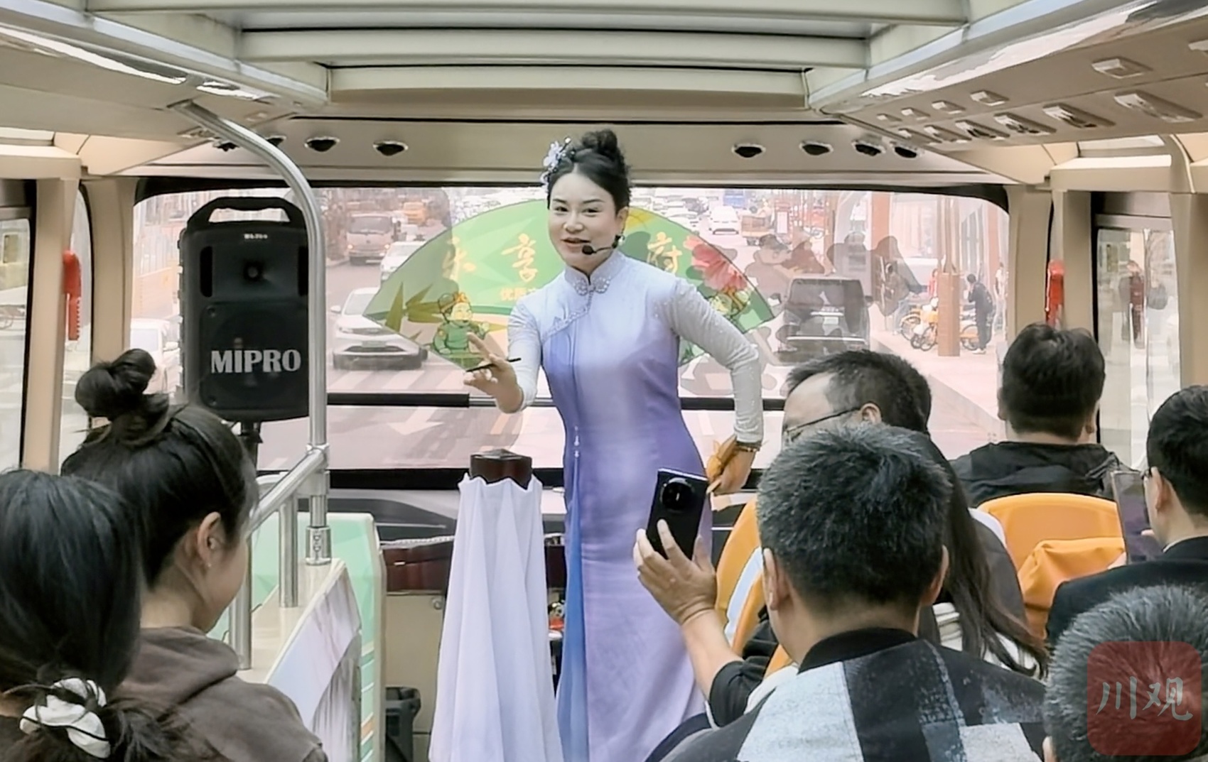 相较于普通观光巴士,这条线路将曲艺表演搬进车厢,四川清音、扬琴、金钱板、相书等节目穿插其间。乘客在沿途观景的同时,也能近距离感受成都曲艺的魅力。