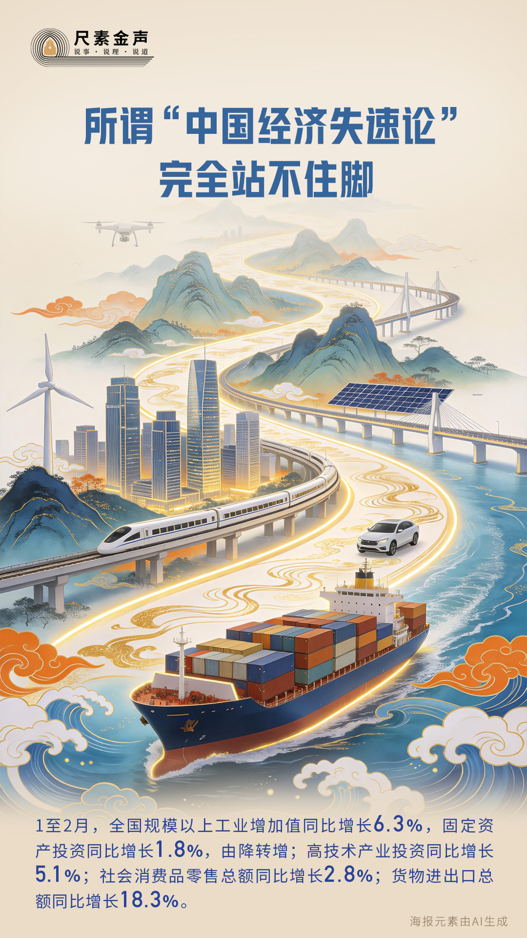 先看看刚发布的今年前两个月的中国经济数据:1至2月,全国规模以上工业增加值同比增长6.3%,固定资产投资同比增长1.8%,由降转增;高技术产业投资同比增长5.1%;社会消费品零售总额同比增长2.8%;货物进出口总额同比增长18.3%。开年就有这样的表现,哪儿有“失速”“疲软”的样子?