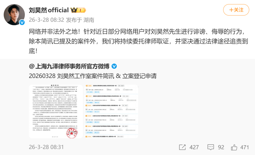 今天(3月28日),刘昊然工作室转发消息,所委托律所今早再次发布公告。据律所今早发布的截图显示,已以“刘源”(艺名刘昊然)名义提交多份名誉权纠纷立案登记申请。