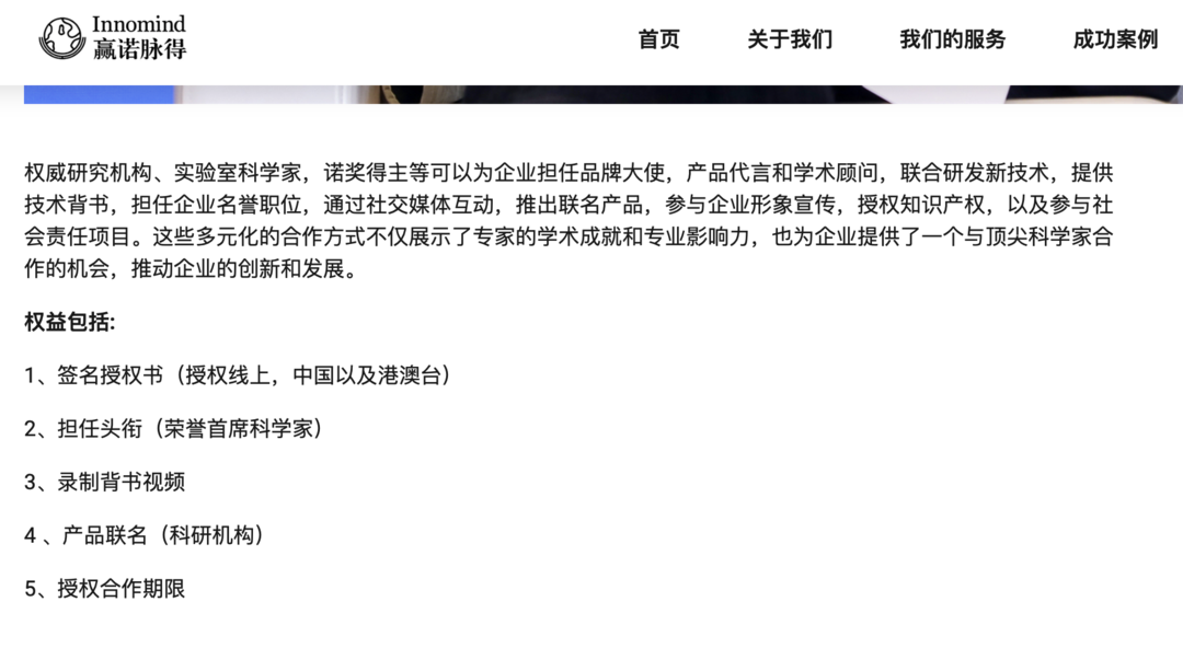 一家名为“赢诺脉得”的中介公司,官网宣传从事“邀约诺奖得主及顶尖科学家为品牌赋能”业务,可为企业邀请诺奖得主授权使用“荣誉首席科学家”称号、出镜录制背书视频,或者建立联合实验室、工作站。