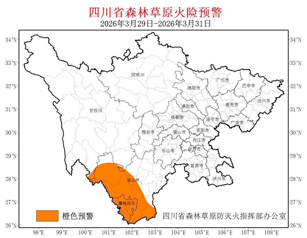 经省森林草原防灭火指挥部办公室与省林草局、四川气象局及相关地方会商研判,结合气象条件、林区物候、人为活动、野外火源及历史火灾发生情况,预计3月29日—31日攀枝花市,凉山州西部、南部和中部森林草原火险等级将维持在高度危险级别,特发布高森林草原火险橙色预警(涉及11个县级行政单位,具体范围见下图)。