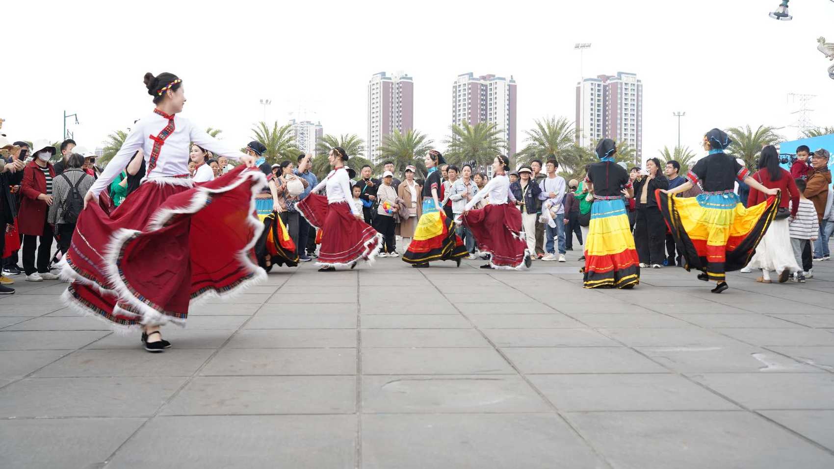 3月28日,天气晴好,成都市青白江区凤凰湖旅游景区内,上万余株樱花进入盛花期,连片绽放的绚烂花海引来成千上万的游人踏青赏花。在景区的汉唐街入口,由甘孜州九龙县带来的民族歌舞表演正在上演,一旁的“九龙秘境”主题展销区吸引许多市民游客。