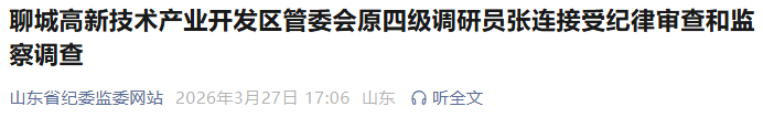 据聊城市纪委监委消息:聊城高新技术产业开发区管委会原四级调研员张连涉嫌严重违纪违法,目前正接受聊城市纪委监委纪律审查和监察调查。