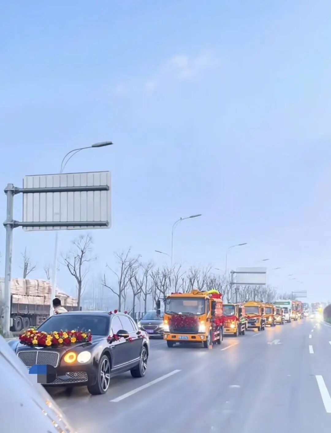 消息一出,全国同行响应。山东滕州,安徽合肥、蚌埠,还有湖北随州的车商,纷纷把吸粪车洗刷干净,驱车数百公里赶来。迎亲头车是安徽合肥同行支援过来的,车头铺满玫瑰,挂着红飘带,侧边系大红蝴蝶结,横幅写着:“吸粪车当婚车队,安徽合肥同行祝粪王浩男新婚快乐”。