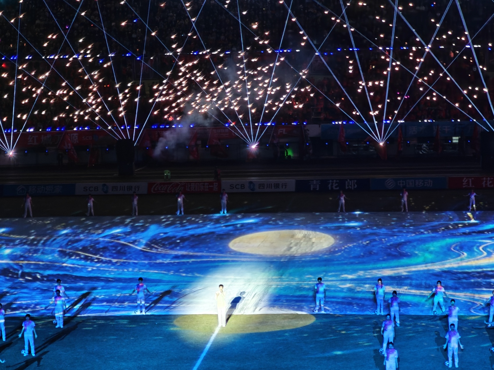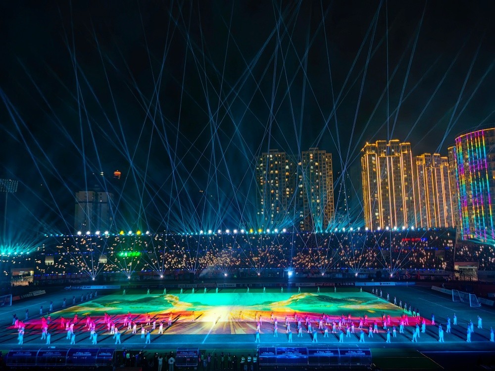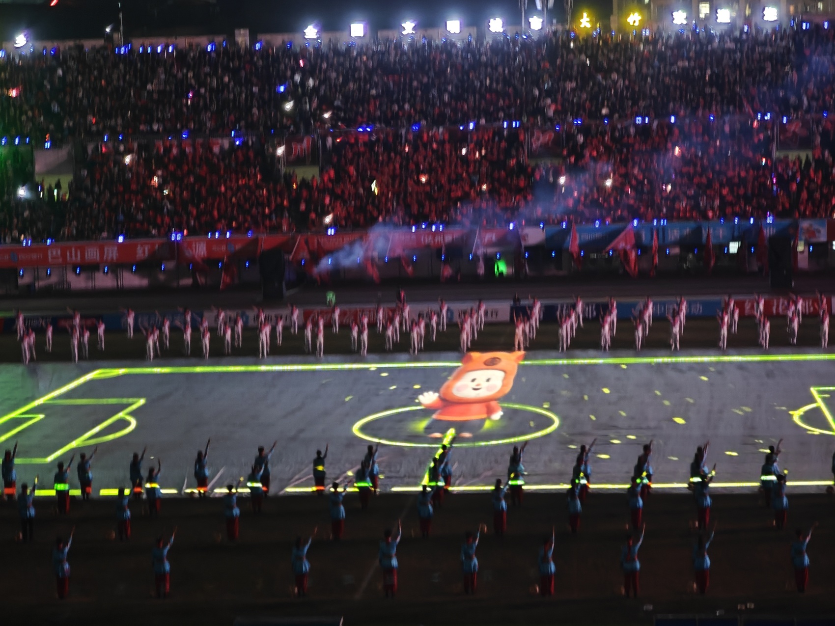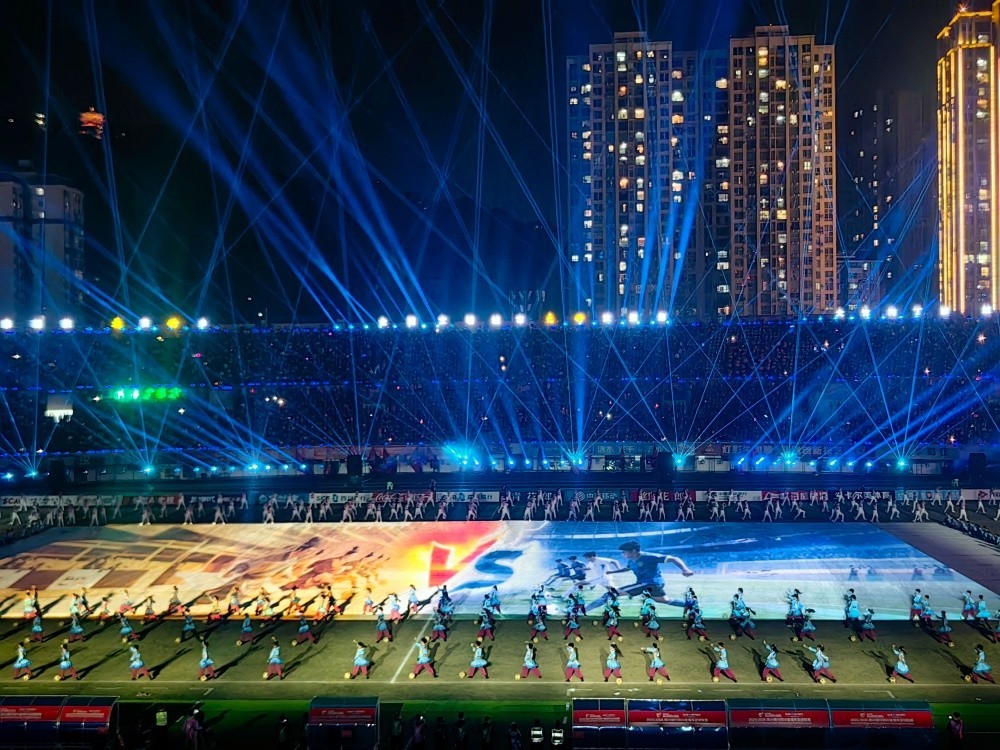 中场休息环节,两大重磅节目将整场展演推向高潮。《时空绿茵・竹光织梦》主题演绎以科技赋能文化表达,激光划破赛场夜空,竹编蹴鞠与现代足球在全息地幕中隔空对话,巴賨文化长卷与机器人“竹大”光影交织,动态演绎出历史厚度与现代活力的共生共长。