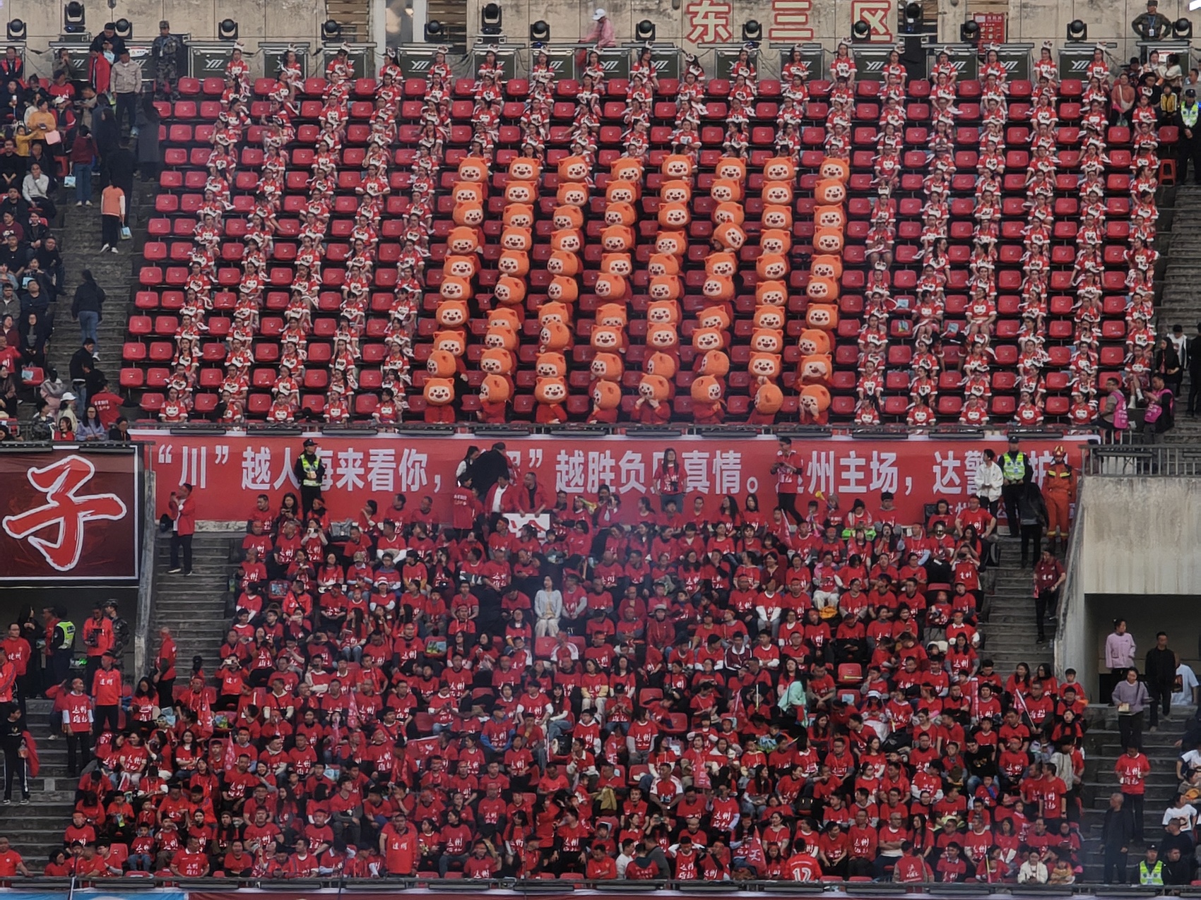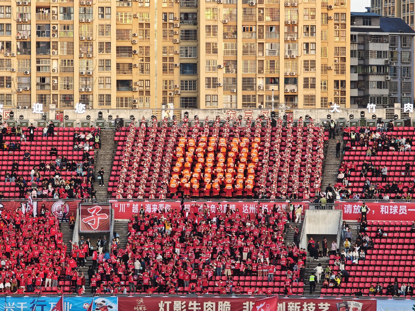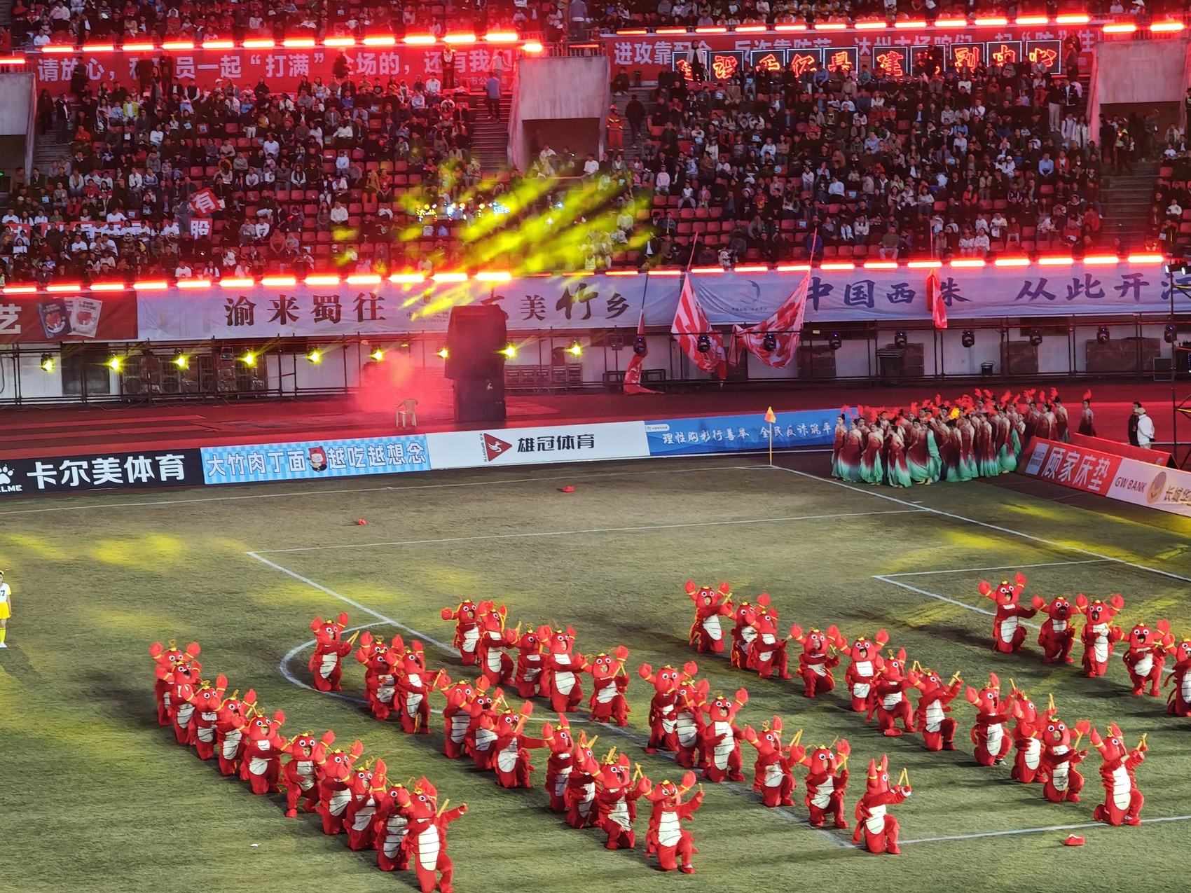 除了舞台上的精彩演绎,大竹元素更是实现了赛事全流程、全场景的深度覆盖。赛场东区顶层全部设置大竹宣传灯牌,东区底层“渝来蜀往大美竹乡”、球场边缘“大竹肉丁面越吃越想念”的标语格外醒目,千名观众席啦啦队身着统一助威服,背后印有“渝来蜀往大美竹乡”字样,形成了声势浩大的竹乡宣传矩阵。