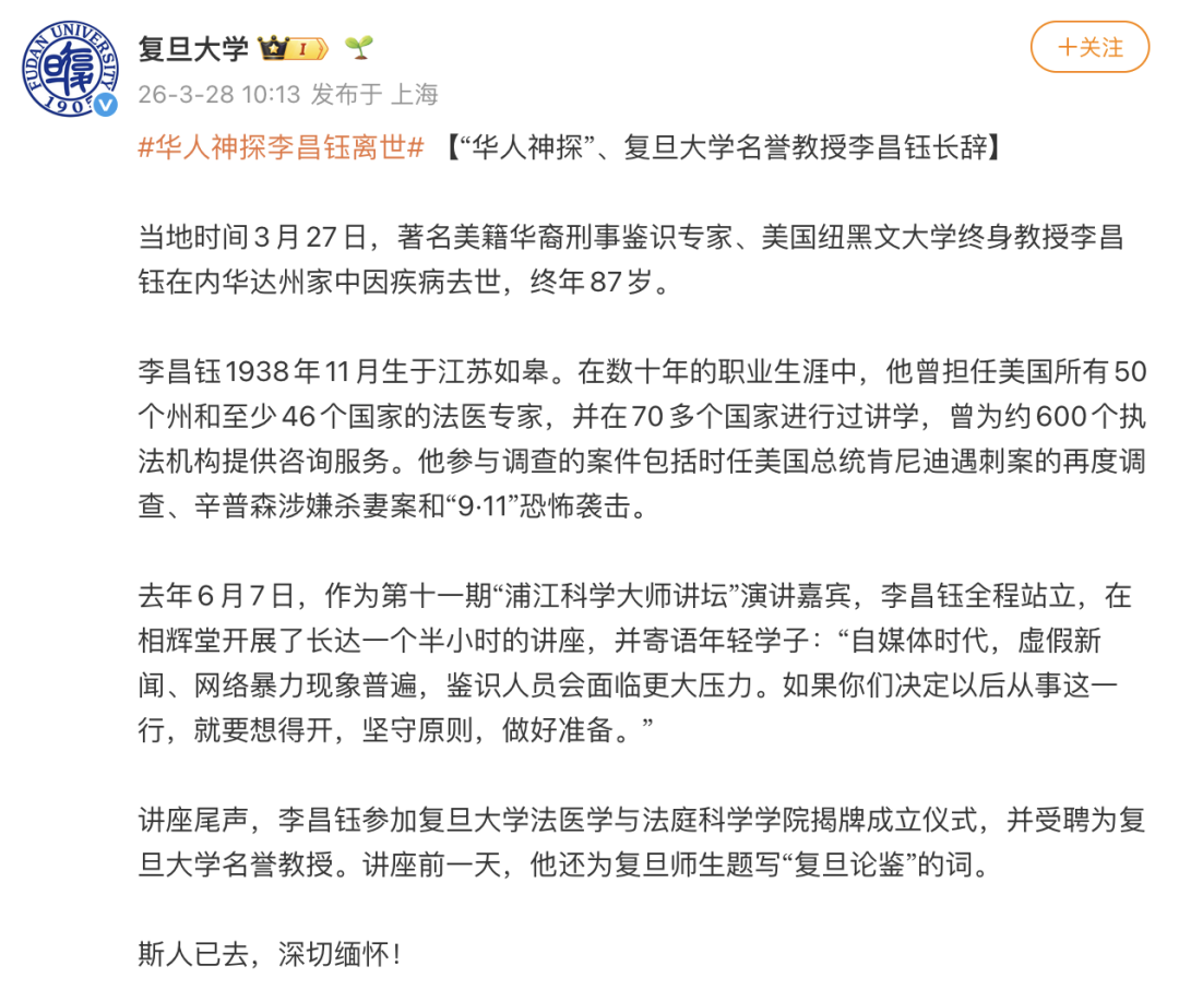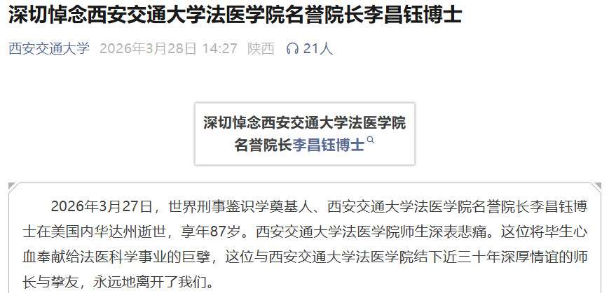 西安交通大学发文:2026年3月27日,世界刑事鉴识学奠基人、西安交通大学法医学院名誉院长李昌钰博士在美国内华达州逝世,享年87岁。西安交通大学法医学院师生深表悲痛。这位将毕生心血奉献给法医科学事业的巨擘,这位与西安交通大学法医学院结下近三十年深厚情谊的师长与挚友,永远地离开了我们。
