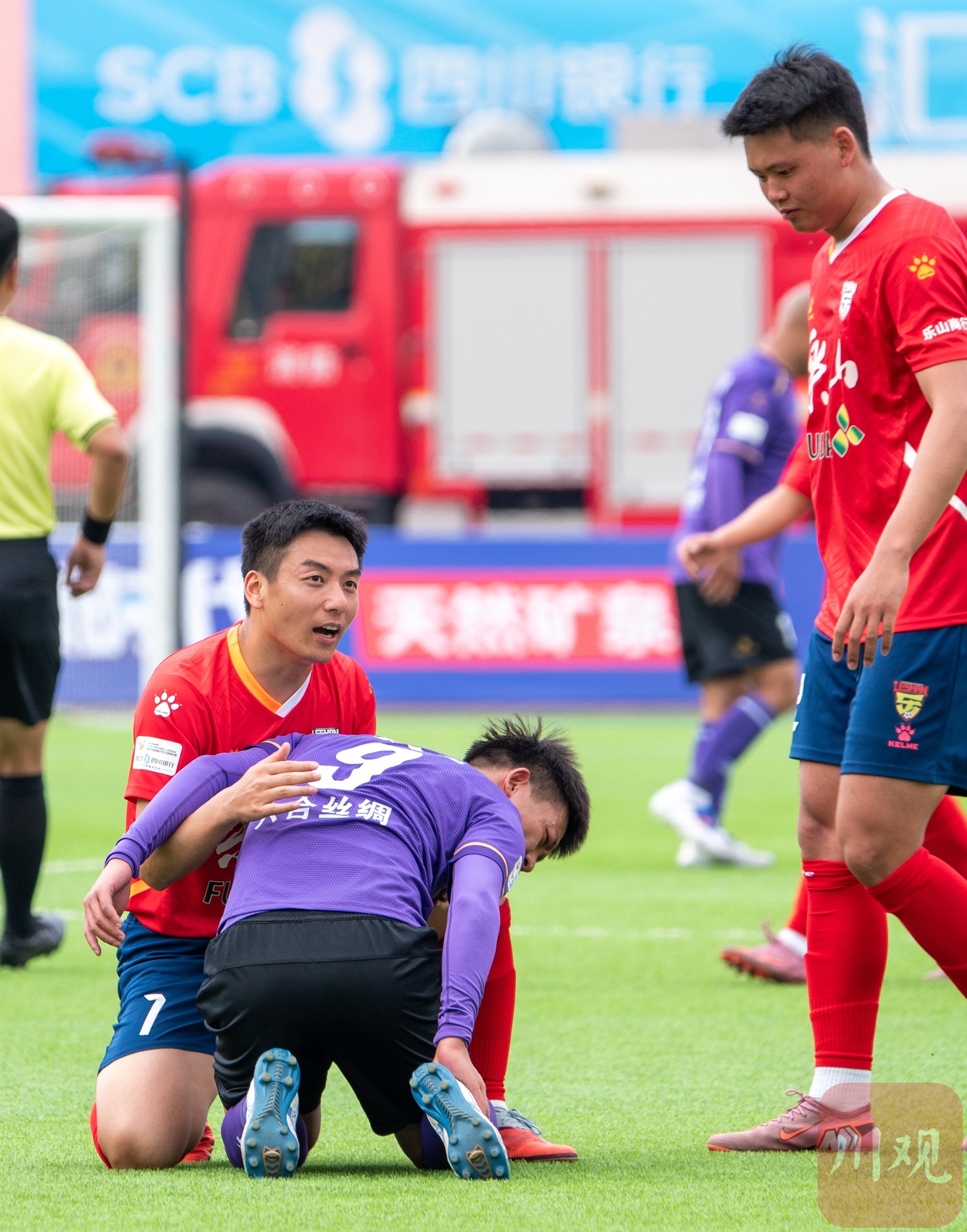 比赛温情一幕:乐山球员搀扶受伤的南充球员。C视觉签约摄影师 郭世平