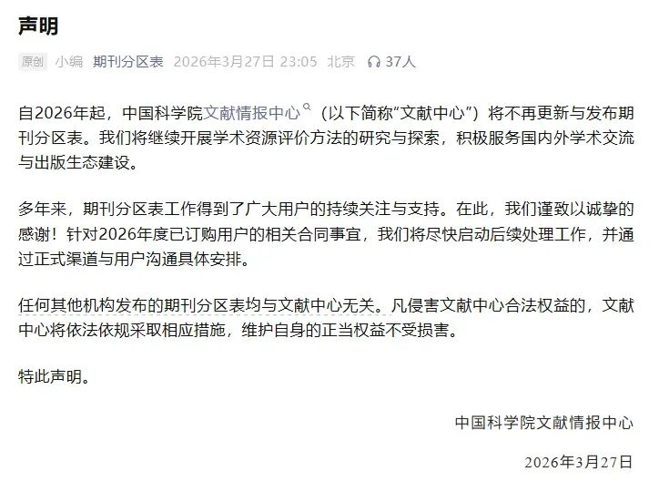 3月27日晚,中国科学院文献情报中心发布官方通告称“将不再更新与发布期刊分区表”,这标志着中国科学院期刊分区表正式停更。该声明特别强调,“任何其他机构发布的期刊分区表均与文献中心无关。”