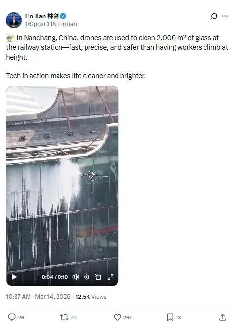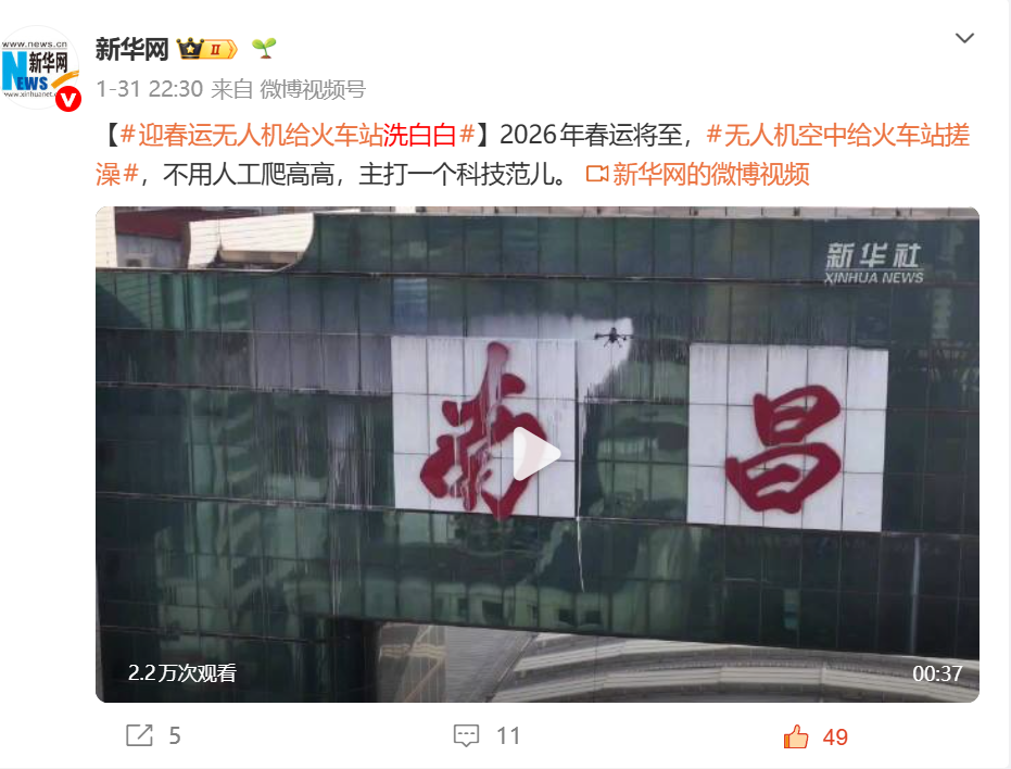 近日,中国外交部发言人林剑在海外社交平台发布视频,向世界推介南昌站无人机高空清洁站房玻璃的创新应用,称赞这一举措“速度快、精度高,而且比让工人攀高作业更安全”,直言“科技让生活更洁净、更明亮”。