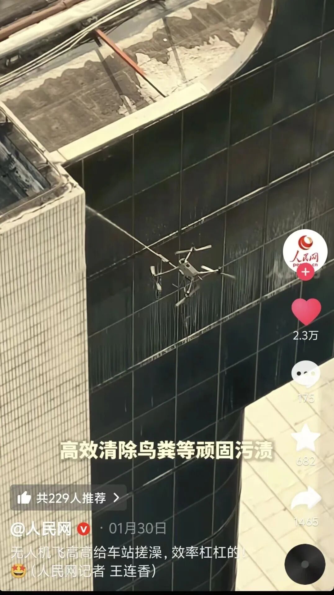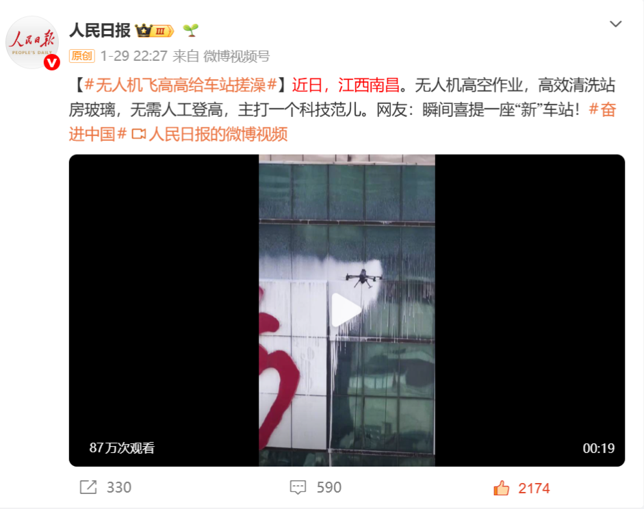 “在中国南昌,无人机被用于清理火车站2000平方米的玻璃——速度快、精度高,而且比让工人攀高作业更安全。科技在行动中让生活变得更洁净、更明亮。”