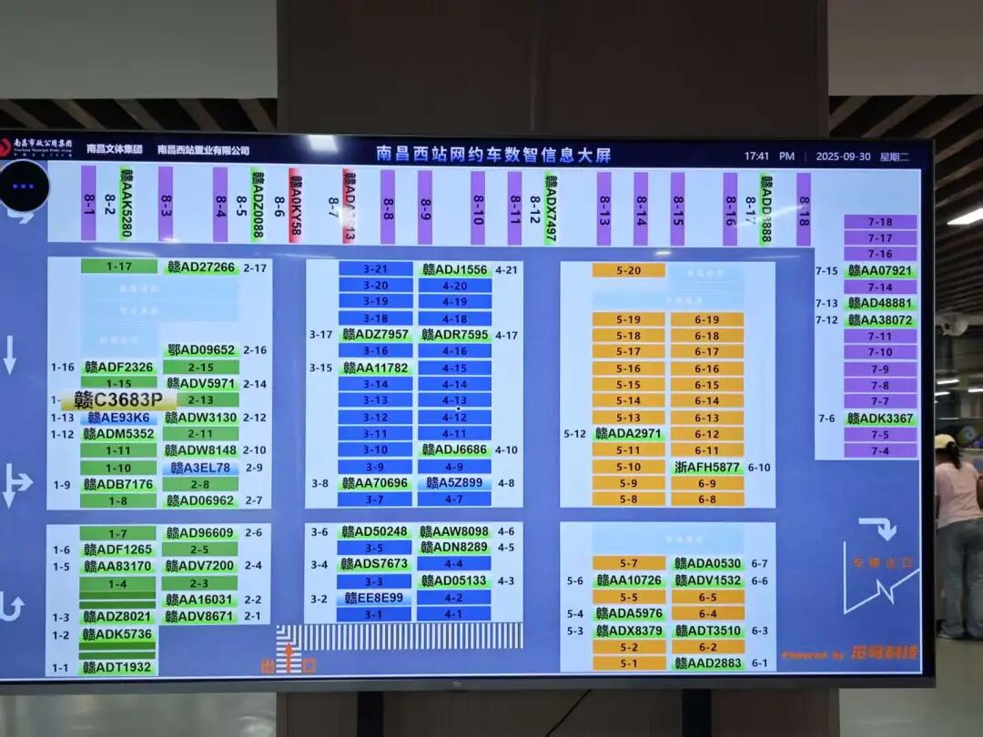 升级改造后的智能化系统依托16平方米的大屏,实时显示整个负二层停车场的平面图。司机接单后,旅客就能在大屏上找到对应的车牌号。