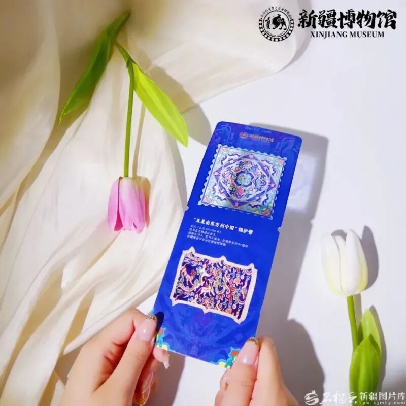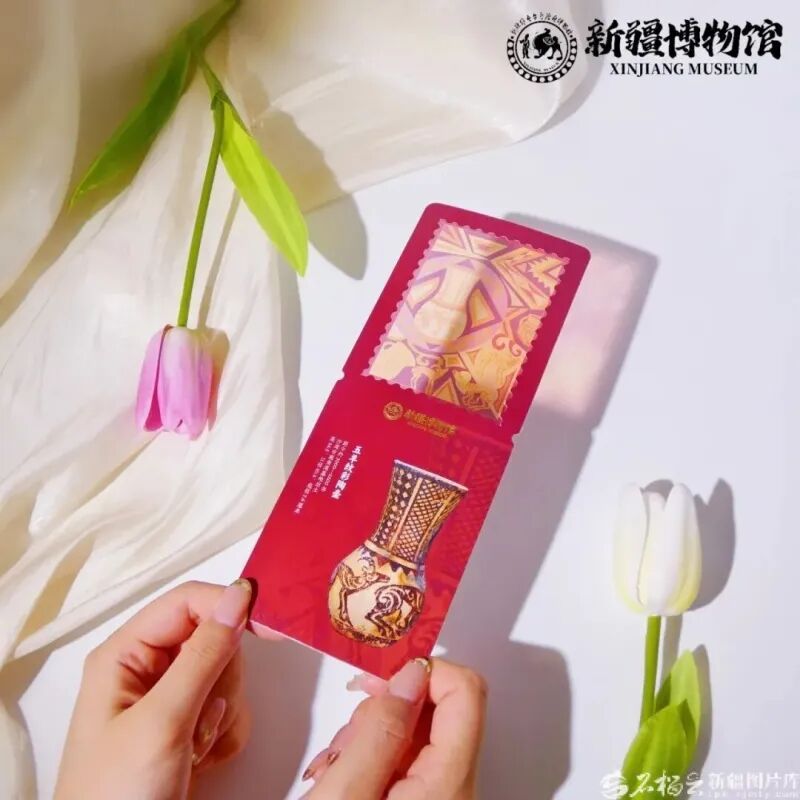新疆博物馆文创柜台工作人员介绍,这套纪念票以4件镇馆之宝为底本:“五星出东方利中国”锦护臂、五羊纹彩陶壶、彩绘伏羲女娲绢画,还有“望四海贵富寿为国庆”锦。每一枚纪念票,都对应着一段沉甸甸的历史。