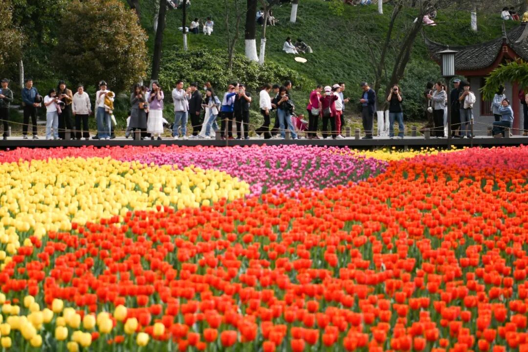3月27日,市民游客在兴庆宫公园赏花拍照。近日,西安兴庆宫公园内郁金香次第开放,春日生机扑面而来,不少市民游客漫步花丛中拍照留念。缤纷的花海与惬意的游人相映成景,勾勒出一幅温馨美好的春日画卷。(西安报业全媒体记者 郝钟毓 摄)