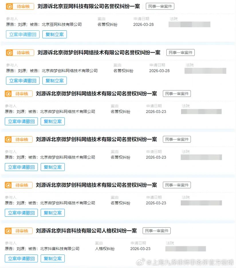 今早,刘昊然工作室转发消息,所委托律所今早再次发布公告。据律所今早发布的截图显示,已以“刘源”(艺名刘昊然)名义提交多份名誉权纠纷立案登记申请。