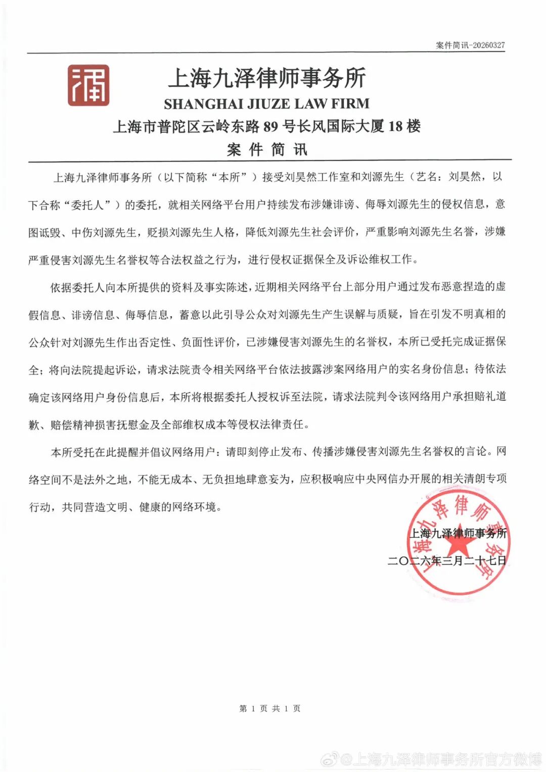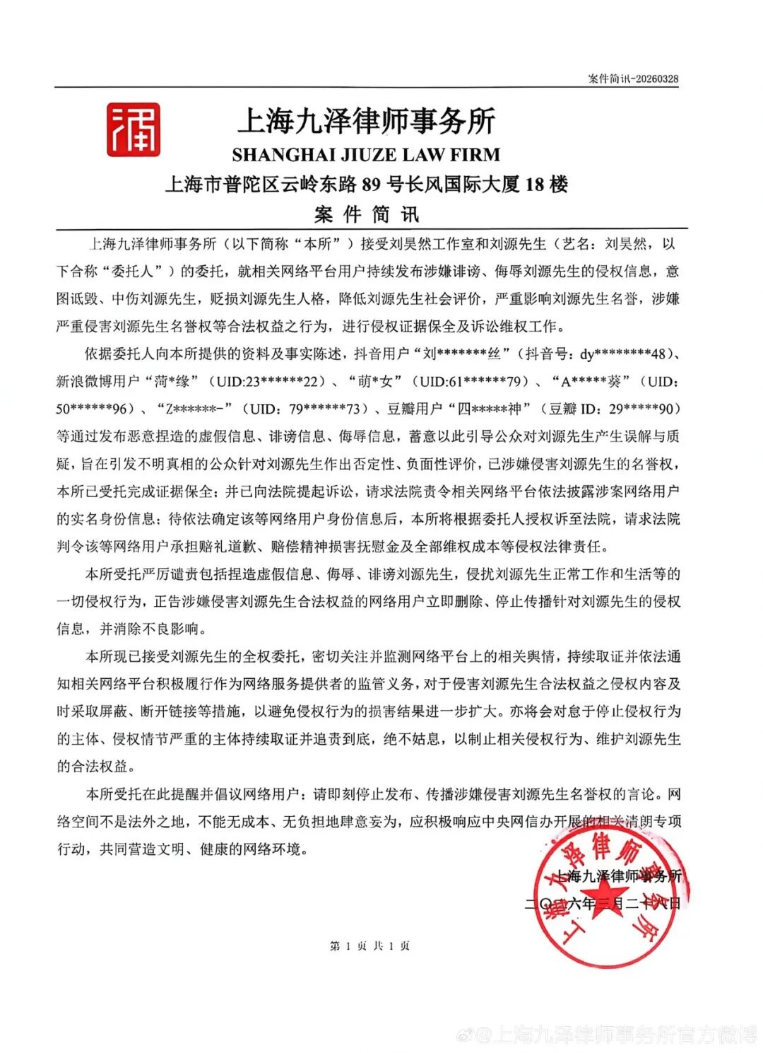 最新公告称,“短视频平台用户“刘*******丝”(dy********48)、微博用户“菏*缘”(UID:23******22)、“萌*女”(UID:61******79)、“A*****葵”(UID:50******96)、“Z******-”(UID:79******73)、豆瓣用户“四****神”(ID:29*****90)等通过发布恶意捏造的虚假信息、诽谤信息、侮辱信息,蓄意以此引导公众对刘源先生产生误解与质疑,旨在引发不明真相的公众针对刘源先生作出否定性、负面性评价,已涉嫌侵害刘源先生的名誉权,本所已受托完成证据保全;并已向法院提起诉讼,请求法院责令相关网络平台依法披露涉案网络用户的实名身份信息:待依法确定该等网络用户身份信息后,本所将根据委托人授权诉至法院,请求法院判令该等网络用户承担赔礼道歉、赔偿精神损害抚慰金及全部维权成本等侵权法律责任。”