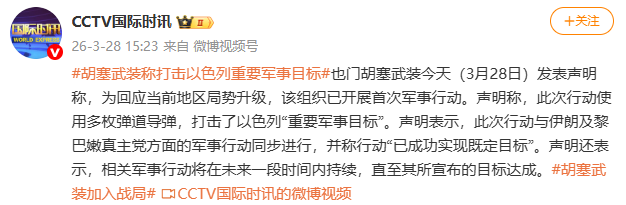 也门胡塞武装今天(3月28日)发表声明称,为回应当前地区局势升级,该组织已开展首次军事行动。声明称,此次行动使用多枚弹道导弹,打击了以色列“重要军事目标”。声明表示,此次行动与伊朗及黎巴嫩真主党方面的军事行动同步进行,并称行动“已成功实现既定目标”。声明还表示,相关军事行动将在未来一段时间内持续,直至其所宣布的目标达成。