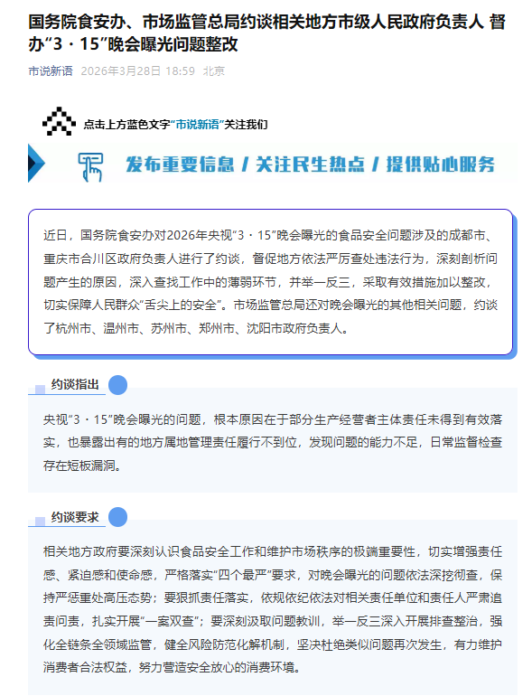 据国家市场监督管理总局官方微信“市说新语”28日消息,近日,国务院食安办对2026年央视“3・15”晚会曝光的食品安全问题涉及的成都市、重庆市合川区政府负责人进行了约谈,督促地方依法严厉查处违法行为,深刻剖析问题产生的原因,深入查找工作中的薄弱环节,并举一反三,采取有效措施加以整改,切实保障人民群众“舌尖上的安全”。市场监管总局还对晚会曝光的其他相关问题,约谈了杭州市、温州市、苏州市、郑州市、沈阳市政府负责人。
