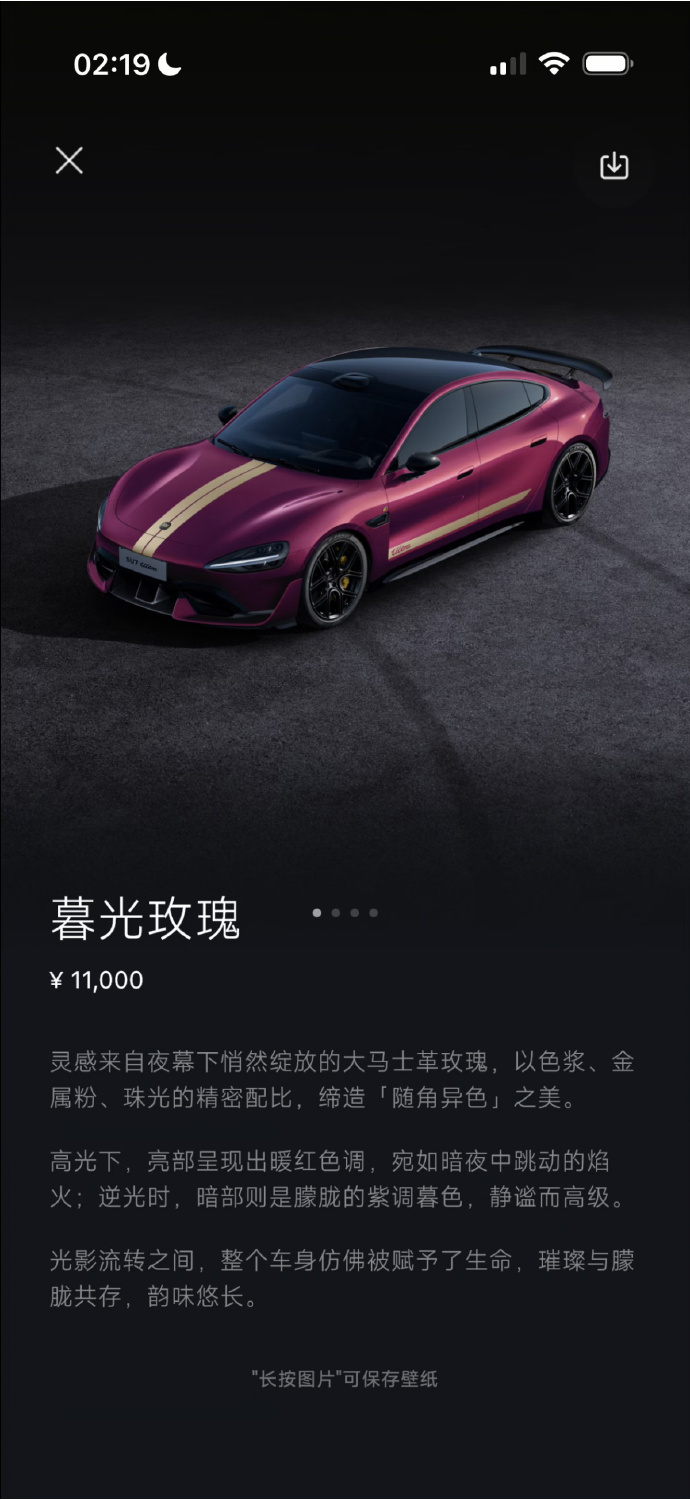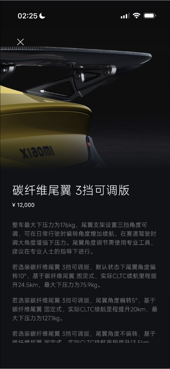 3月28日凌晨,小米 SU7 Ultra 推出了全新的暮光玫瑰车漆,以及全新的三档可调的碳纤维尾翼,选装价分别为 11000 元和 12000 元。