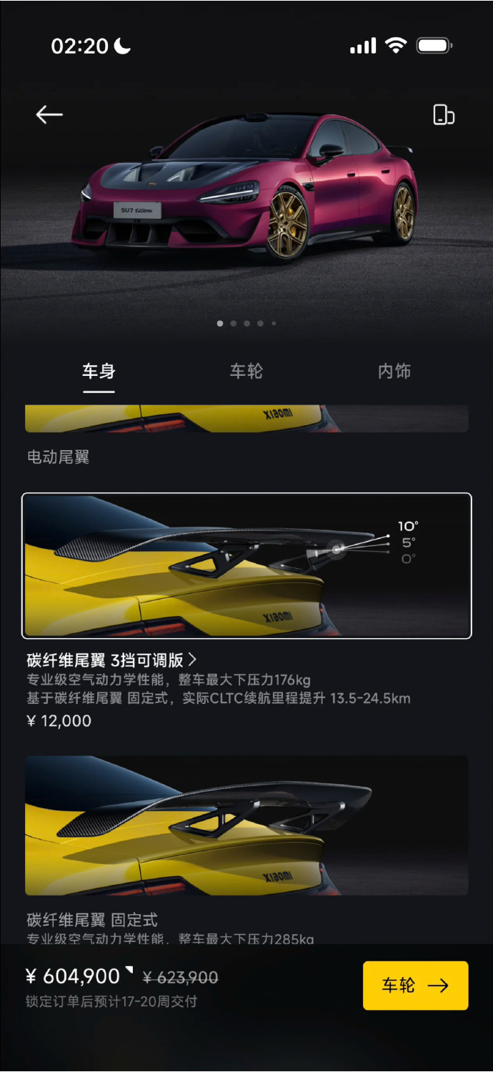 根据官方介绍,暮光玫瑰色灵感来自夜幕下悄然绽放的大马士革玫瑰,以色浆、金属粉、珠光的精密配比,缔造「随角异色」之美。碳纤维尾翼则可为 SU7 Ultra 车主带来专业级空气动力学性能,整车最大下压力 176kg,实际 CLTC 续航里程提升 13.5-24.5km。