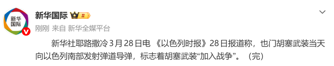 《以色列时报》28日报道称,也门胡塞武装当天向以色列南部发射弹道导弹,标志着胡塞武装“加入战争”。