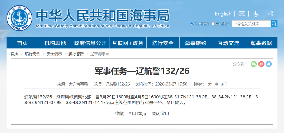 据中国海事局网站消息,大连海事局发布航行警告,3月29日16时至4月5日16时,渤海海峡黄海北部部分海域范围内执行军事任务,禁止驶入。