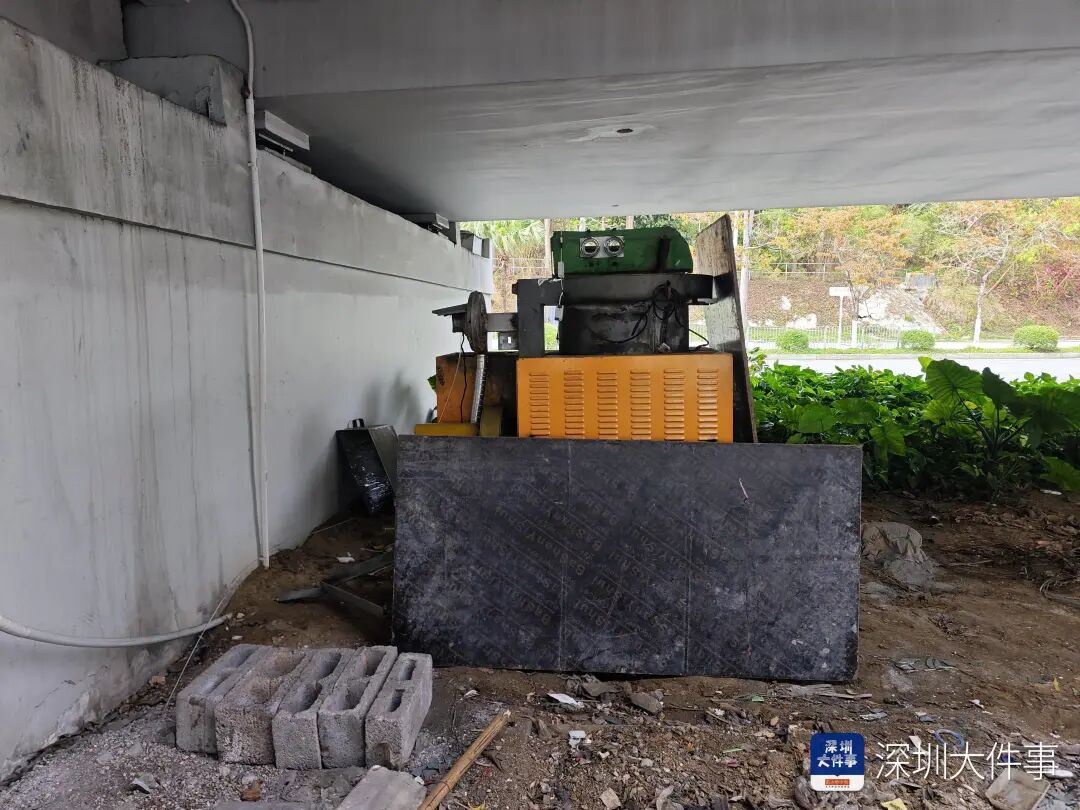 26日下午,南都N视频记者在居民所举报的位置看到,西乡大道与宝安公园路立交桥桥下一处绿化带内停放着一台专业的泡沫熔炼设备,四周用几块挡板围护,不远处还堆放着一小堆废弃泡沫。