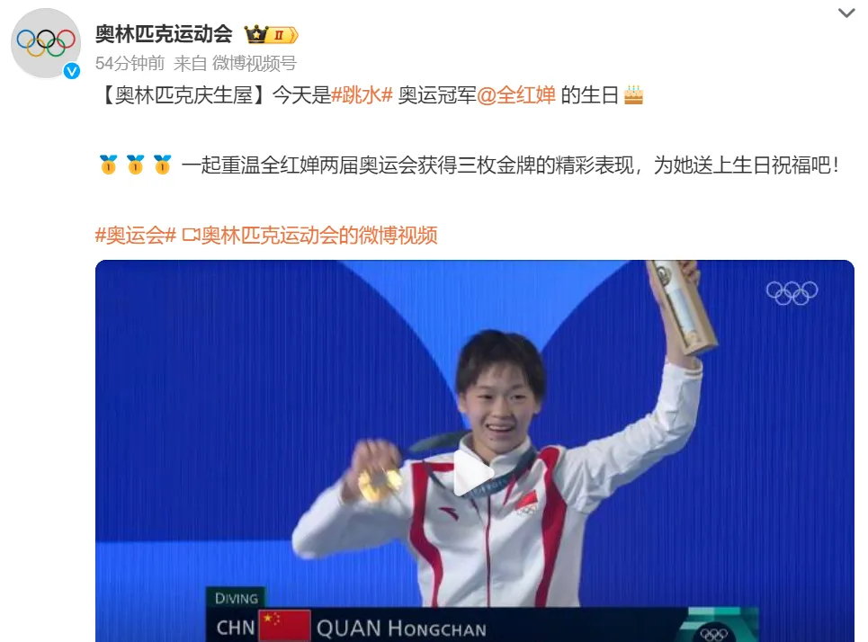3月28日,@奥林匹克运动会 发文为全红婵庆祝19岁生日: 一起重温全红婵两届奥运会获得三枚金牌的精彩表现,为她送上生日祝福吧!
