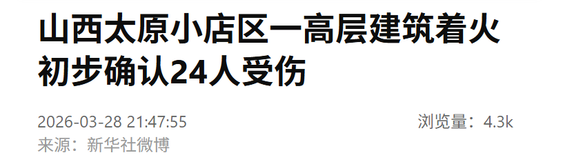 据新华社消息,记者从山西省太原市小店区委宣传部获悉,28日晚,位于小店区亲贤北街附近的一高层建筑着火,目前明火已扑灭,初步确认有24人受伤。
