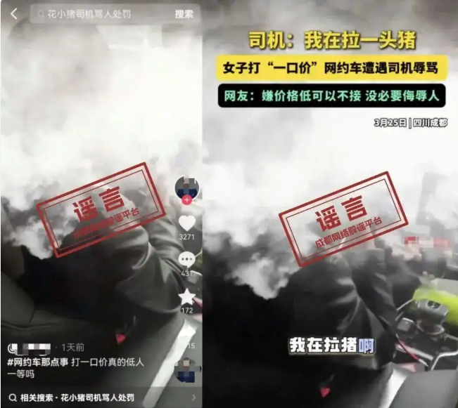 2、男子自导自演“网约车纠纷”被处罚 近日,有人在网络平台发布“网约车驾驶员辱骂乘客”视频,引发社会关注。27日,成都郫都警方通报,李某国为博取关注、吸引流量,自导自演虚构“网约车纠纷”场景,剪辑后以“网约车司机”身份发布于网络平台。日前,公安机关已依法对李某国予以行政处罚,并依法关停其网络账号。(成都网络辟谣)