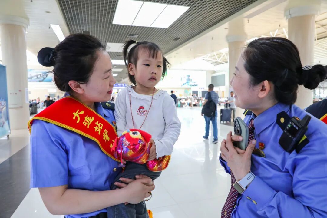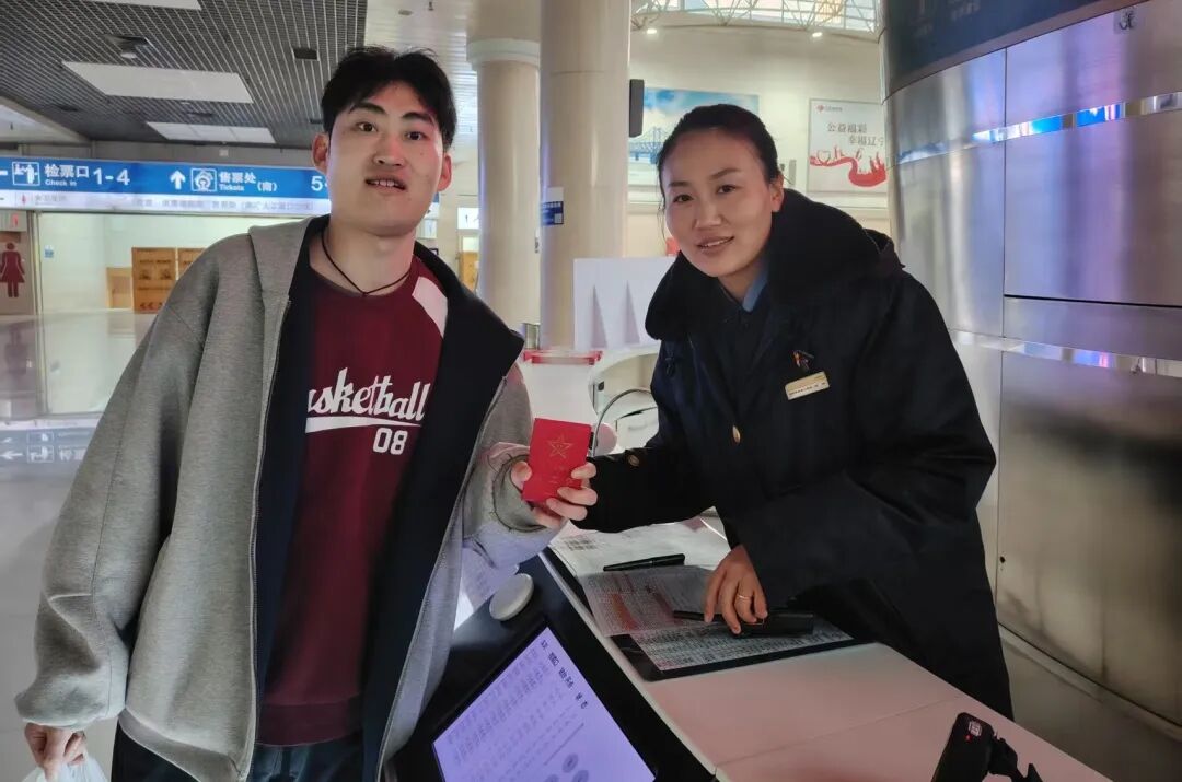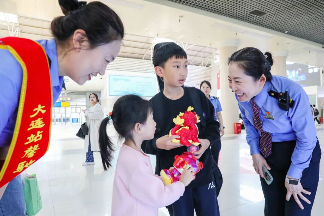 2025年中秋、国庆双节期间,大连站候车大厅内节日氛围浓厚。吕玉霜、刘晓云、刘伟3位不同年代的全国劳动模范,带领青年职工穿梭在旅客中间,提供行李搬运、车次咨询等暖心服务。一句句问候,让旅客们脸上洋溢起笑容。