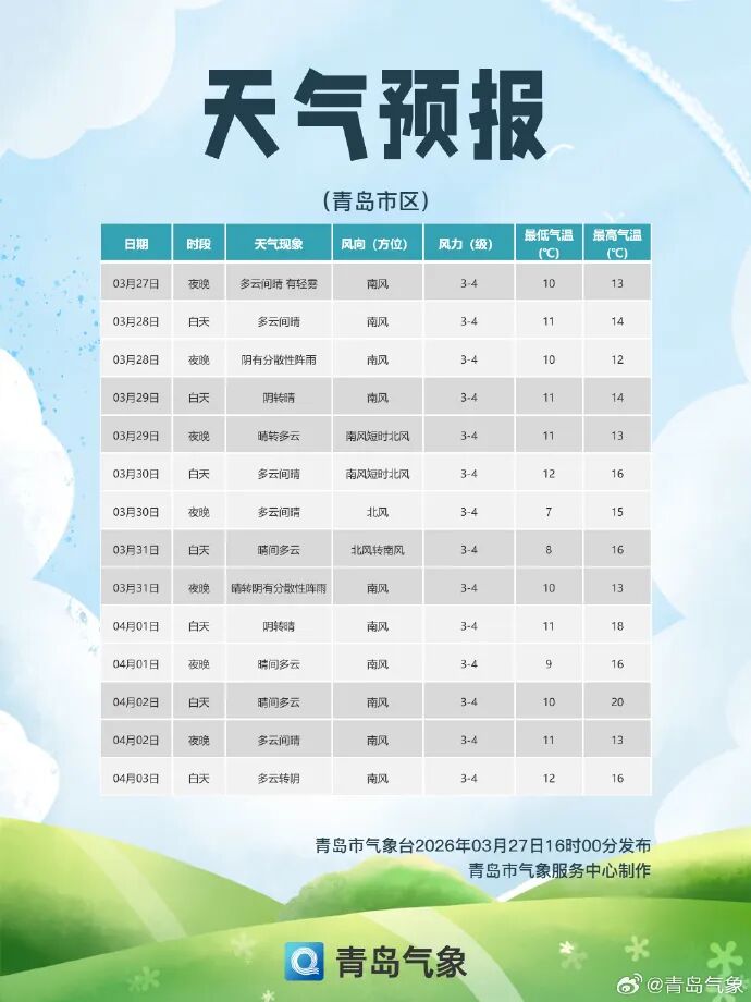 【青岛市区】今天白天,多云间晴,南风3到4级,今天夜间,多云转阴有分散性小阵雨,有轻雾,南风3到4级,今天最高气温14℃,最低气温11℃。相对湿度45%-85%。