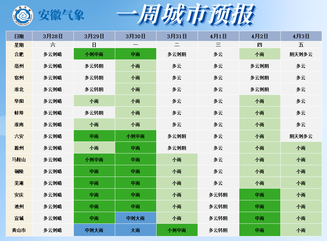 降水:29日夜里-30日我省有一次较明显降水过程,淮河以南部分地区有中雨,局部大雨,同时伴有短时强降水和雷电等强对流天气。31日-4月3日淮河以南多降水。