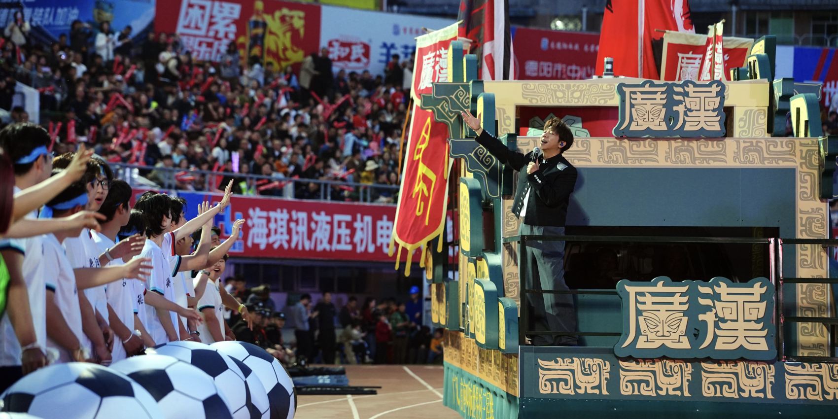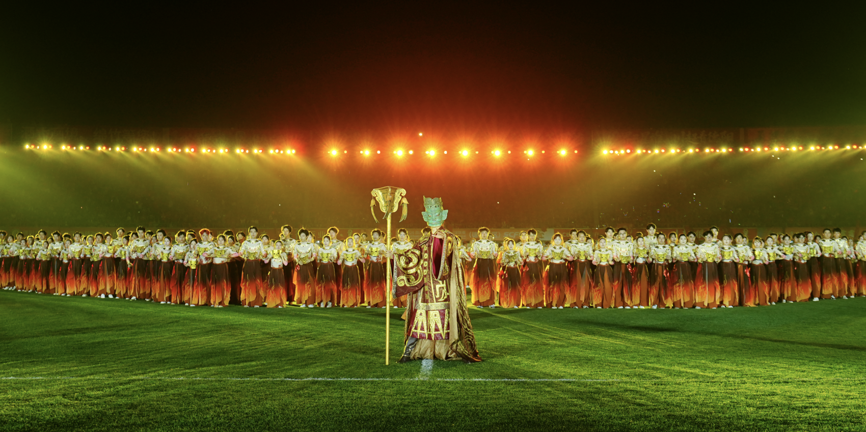 中场秀学子们表演的《都广之野 星汉璀璨》惊艳全场。演员们以庞大且整齐的表演阵容、富有层次与张力的舞台表现,生动演绎出古蜀文明“双星耀世、交相辉映”的万千气象。节目巧妙串联“古蜀制造文明”与德阳“中国装备科技城”的城市底蕴,生动展现出这片土地跨越千年的“制造之魂”,赢得现场观众的阵阵喝彩。