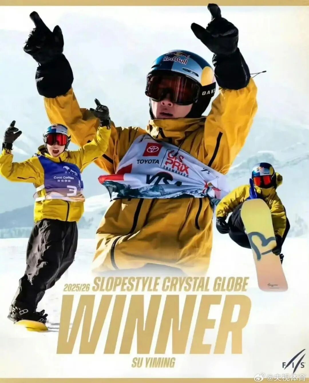 北京时间3月28日,国际雪联宣布,中国选手、山西运动员苏翊鸣荣膺2025-2026赛季单板滑雪男子坡面障碍技巧世界杯总冠军。由于瑞士锡尔瓦普拉纳站男子组比赛因天气原因取消,本赛季该项目所有赛事提前结束,苏翊鸣凭借此前两站分站赛的出色表现,以总积分榜头名身份斩获水晶球奖杯。