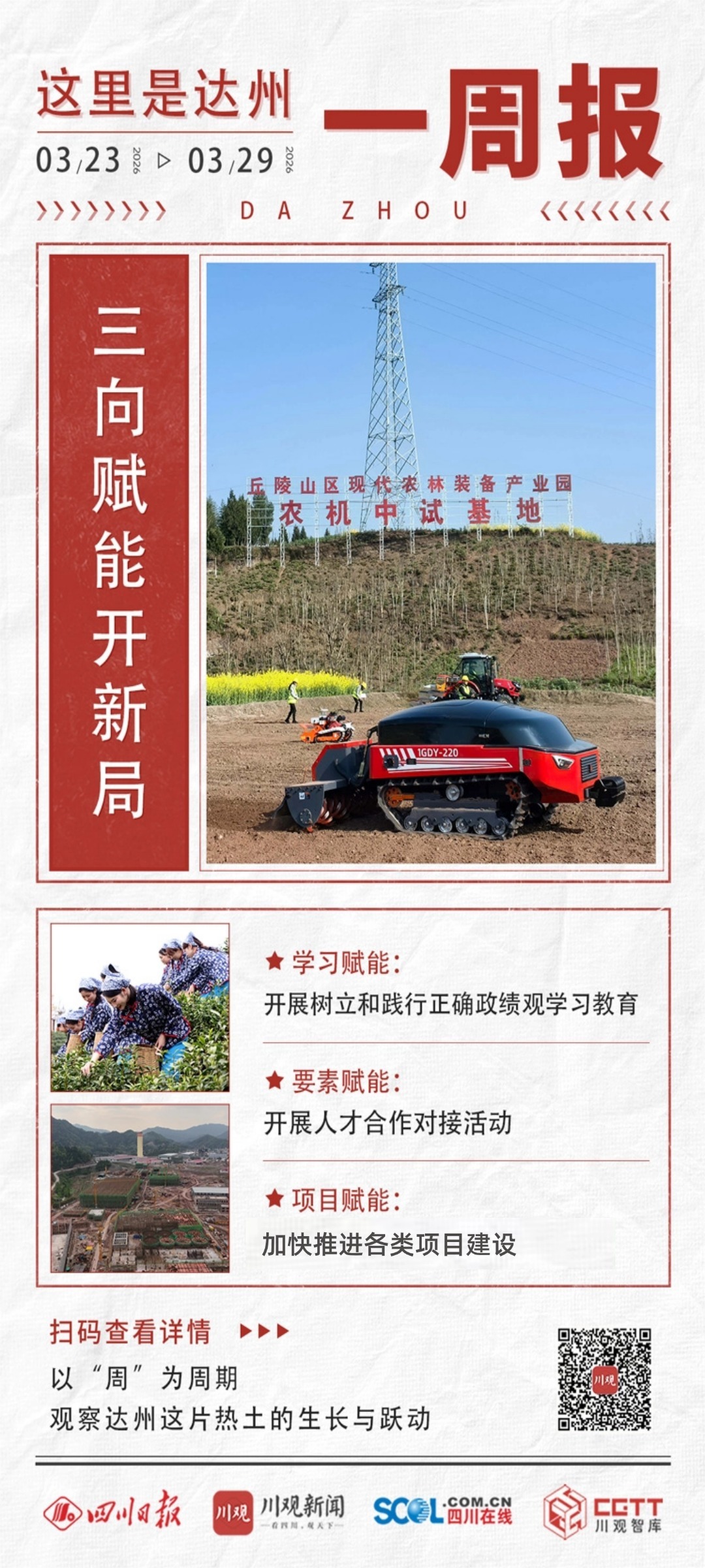 本周(3月23日至29日),达州举行了市级领导干部树立和践行正确政绩观学习教育读书班,市委主要领导率队赴陕西省开展人才合作对接和投资促进活动,市政府主要领导带队赴大竹县督导农文旅融合及特色农产品产业化发展情况。
