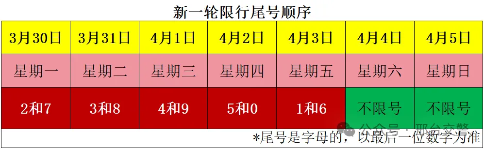 3月30日(周一)起,邢台市机动车尾号限行将进入新一轮轮换期(限行规则与北京保持一致)。